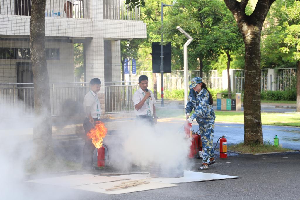 下午4时,演练活动正式拉开序幕。陈永强宣布演练活动正式开始。模拟的烟雾和消防警铃响起,工作人员迅速引导120余名学生有序疏散,消防人员和医护人员也迅速响应,整个演练过程井然有序。疏散演练结束后,物业项目部工程主管潘洪辉为师生们进行了灭火器及微型消防站内消防物资的相关知识讲解和操作示范,进一步增强了师生们的实际操作能力。