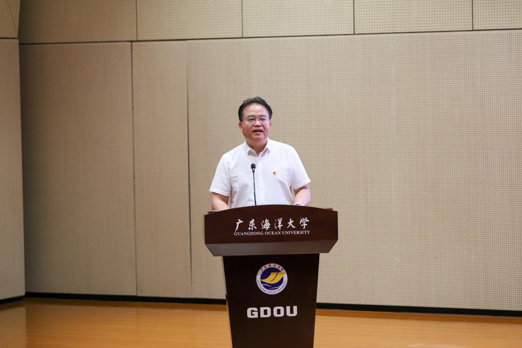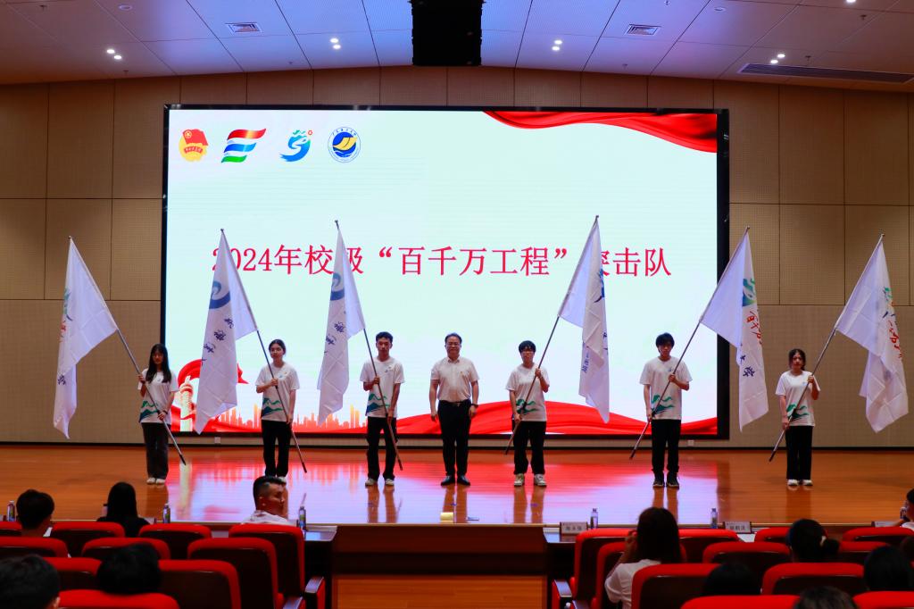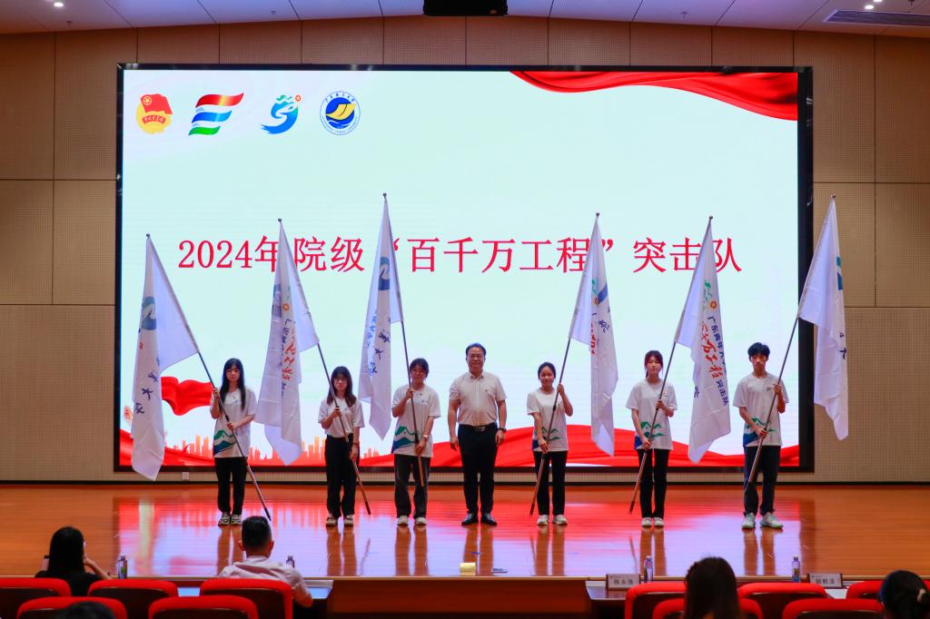 在出征仪式上,孙学甫宣读2024年社会实践团队立项名单及临时团支部组成名单。接着,各社会实践团队临时团支部书记现场重温入团誓词。随后,陈永强作动员讲话,他强调,同学们一要胸怀“国之大者”,成为时代使命的担当者;二要心系“民之所需”,成为乡村振兴的实践者;三要践行“安全第一”,确保实践活动的顺利进行。最后,陈永强、孙学甫分别为广东海洋大学2024年国家资助和助学贷款政策下乡行团队代表、“百千万工程”突击队校院级团队代表授旗。