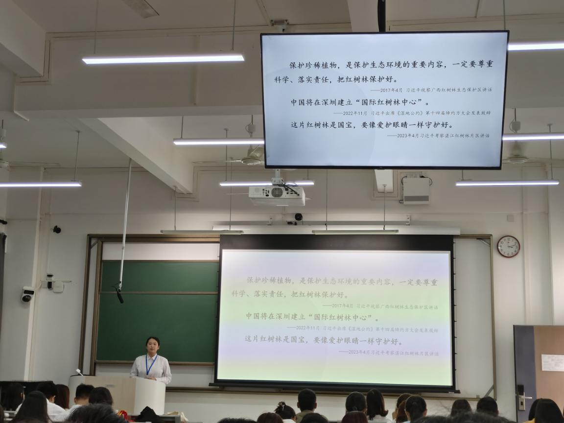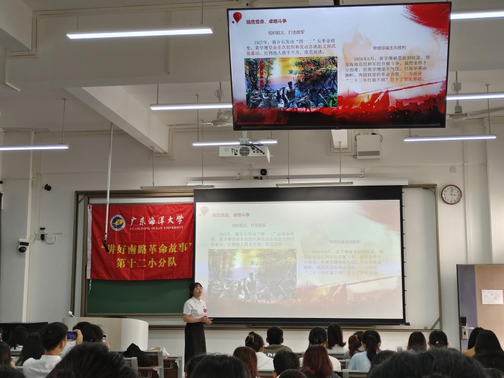 思政课上,“讲好南路革命故事”宣讲员姚爱娥以“星星之火,可以燎原--南路革命烈士黄学增”为题讲述了黄学增烈士潜心学习革命理论,用他的一生点燃了南路革命烽火的故事;宣讲员何梓楠以“为主义牺牲,为工农死节——南路革命烈士朱也赤”为题讲述了朱也赤烈士撒播革命火种,建立苏维埃政权的故事,以此来号召同学们珍惜红色革命历史,学习和传承先烈们的崇高理想和革命精神,为建设一个更加美好的新时代而不懈努力,为中华民族的伟大复兴而努力奋斗。思政小助理吴嘉琪和思政小助理组长黄宇珺通过深刻领悟习近平总书记视察广东时的重要讲话重要指示精神,向同学们分别分享了关于红树林的特点、作用、现状和保护等知识,以及我校在“粤海粮仓”方面的科技研发故事,通过一系列生动的案例阐述了保护海洋生态和建设“蓝色粮仓”的重要性。