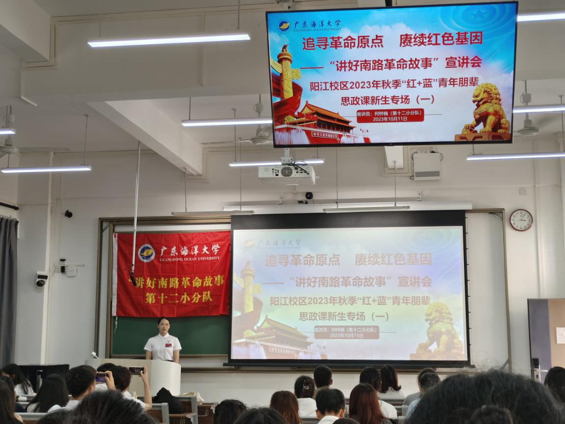 10月11日下午,学校党委第四届“思政小助理”阳江校区小分队成员联合“讲好南路革命故事”第十二小分队宣讲员在慎思楼A103组织开展“红+蓝”青年朋辈思政课新生专场,共140余名学生骨干参与了活动。