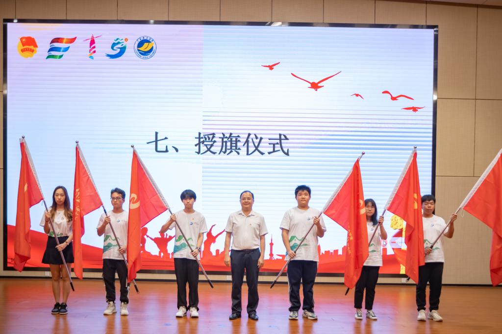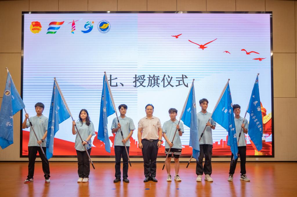 在出征仪式上,周昌仕作动员讲话,他强调实践活动要展现出当代大学生为党和国家建功立业、砥砺前行的坚定决心和积极风貌,并提了三点希望:一要胸怀“国之大者”,肩负新时代青年的使命与担当;二要心系“民之所向”,当好助力乡村振兴的青年突击队;三要落实责任、精心组织、周密安排,保障师生安全。陈永强宣读了2022年暑期“三下乡”社会实践表彰名单,周昌仕、陈永强、翁江峰分别为2022年暑期“三下乡”社会实践优秀团队、先进个人和优秀作品获得者颁奖。随后,各社会实践团队临时团支部书记现场重温入团誓词,坚定了团员青年的理想信念,表达了团员青年积极投身祖国建设的决心。最后,周昌仕、陈永强分别为广东海洋大学“百千万工程”突击队和2023年暑期“三下乡”社会实践团队代表授旗。