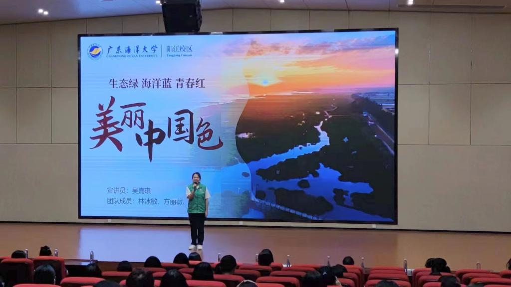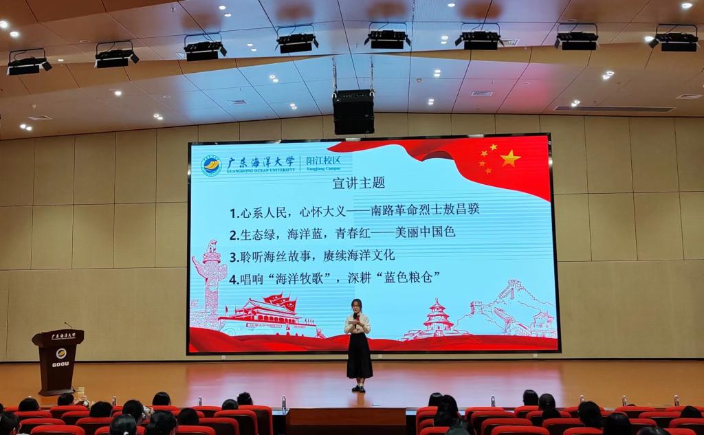 宣讲中,“讲好南路革命故事”宣讲员何梓楠以“心系人民,心怀大义——南路革命烈士敖昌骙”为题讲述了敖昌骙烈士心怀大善,为了改变中国劳苦大众的生活现状而奋斗终生的故事,以此来号召同学们传承红色基因,赓续红色血脉,争做堪当民族复兴重任的时代新人。“思政小助理”宣讲员吴嘉琪从红树林的特点、作用、现状、保护等方面,跟大家分析了保护“海岸卫士”红树林的重要性,号召同学们发挥青春力量一起来守护红树林。李强则结合阳江本土海洋文化资源——“南海I号”和大澳渔港讲述了阳江的海丝故事,并向同学们发起倡议,希望同学们充分挖掘海洋文化资源,提高文化自觉,讲好海洋文化故事。黄宇珺以“唱响‘海洋牧歌’,深耕‘蓝色粮仓’”为题与同学们一起学习了习近平总书记在湛江考察时关于建设“海洋牧场”、“蓝色粮仓”的指示精神,讲述了我校在“粤海粮仓”建设中做出的海大贡献,号召同学们要深刻认识海洋强国建设的重大意义,弘扬科学家精神,提高海洋科学文化素质,积极加入海洋生态保护和宣传的志愿服务中,共建青春之未来。