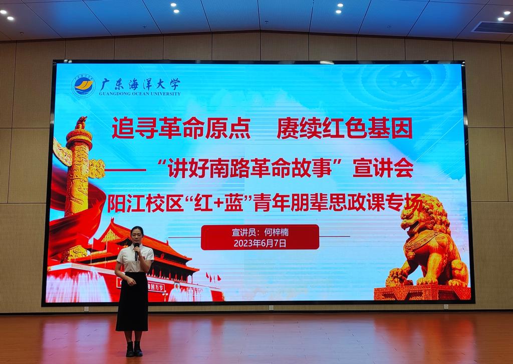为深入开展学习贯彻习近平新时代中国特色社会主义思想主题教育,6月7日下午,校区“讲好南路革命故事”第十二小分队宣讲员和“思政小助理”阳江校区小分队宣讲员开讲了“红+蓝”青年朋辈思政课。校区180余名学生代表参与了学习。