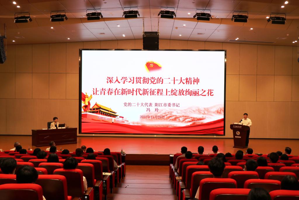 11月28日,阳江市委书记、市人大常委会主任冯玲到阳江校区调研并宣讲党的二十大精神,强调要深入学习宣传贯彻党的二十大精神,坚持党对高校工作的全面领导,坚持社会主义办学方向,坚持为党育人、为国育才,全面落实立德树人根本任务,加强思想政治教育,着力培养德智体美劳全面发展的社会主义建设者和接班人。学校党委书记杨洲陪同调研并主持宣讲会。
