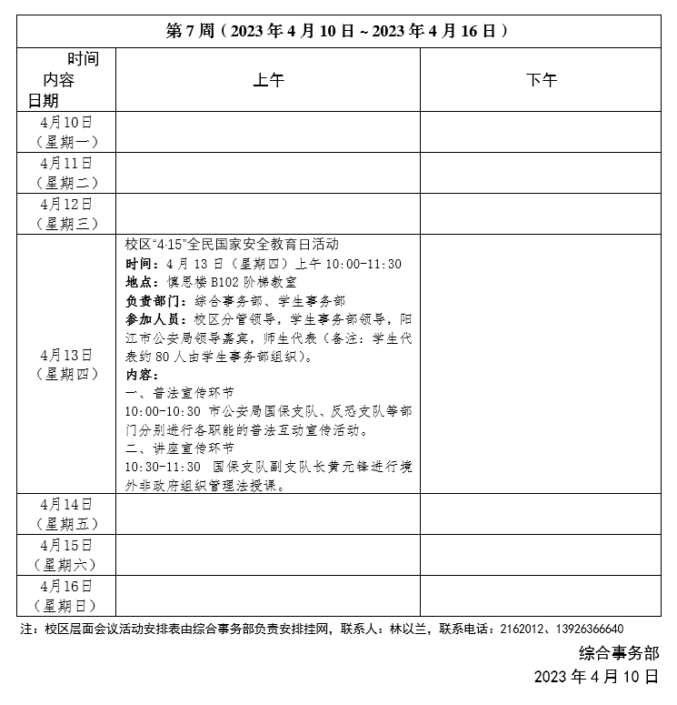 2022~2023学年第二学期第07周会议活动安排表