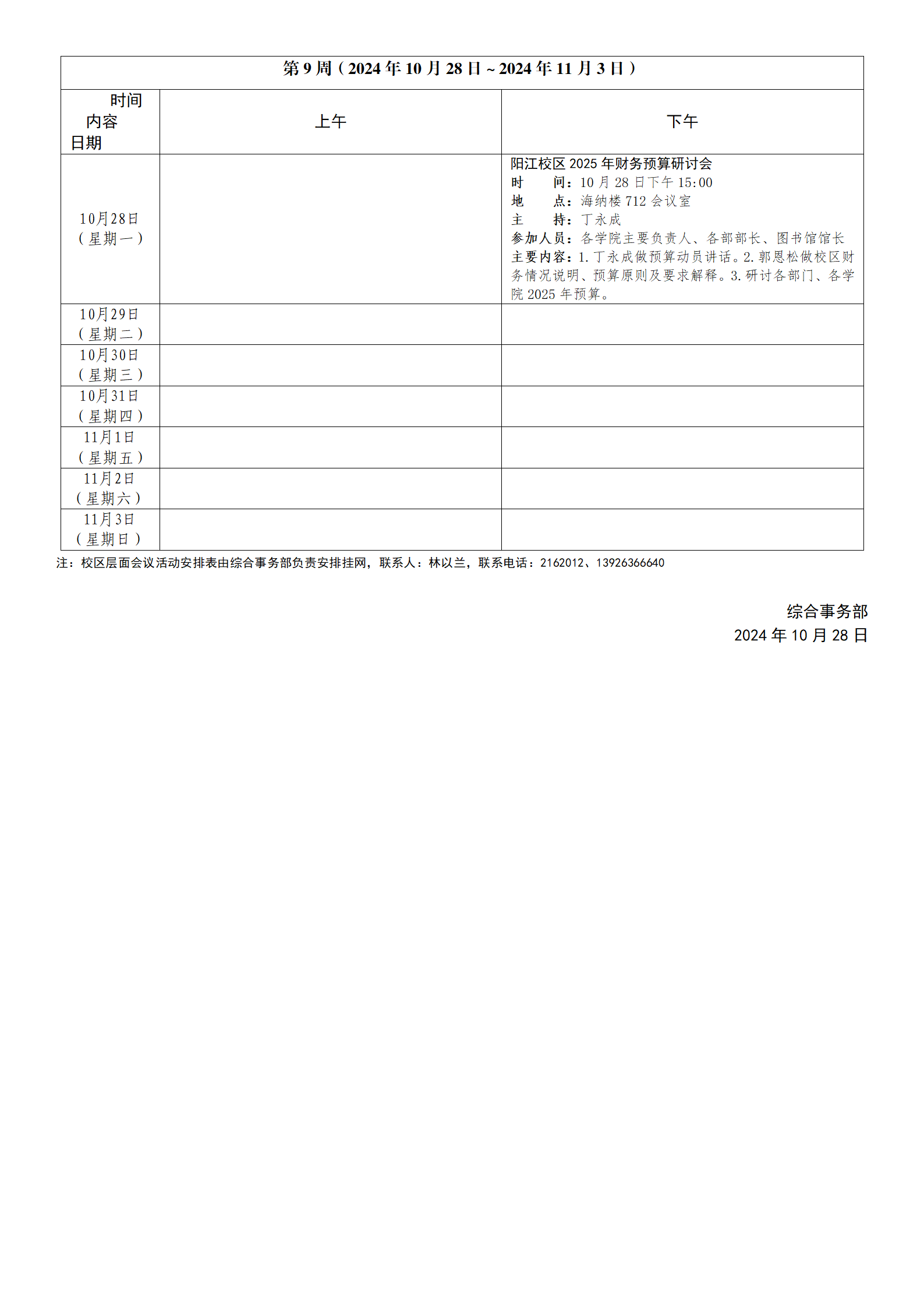 2024~2025学年第一学期第9周会议活动安排表