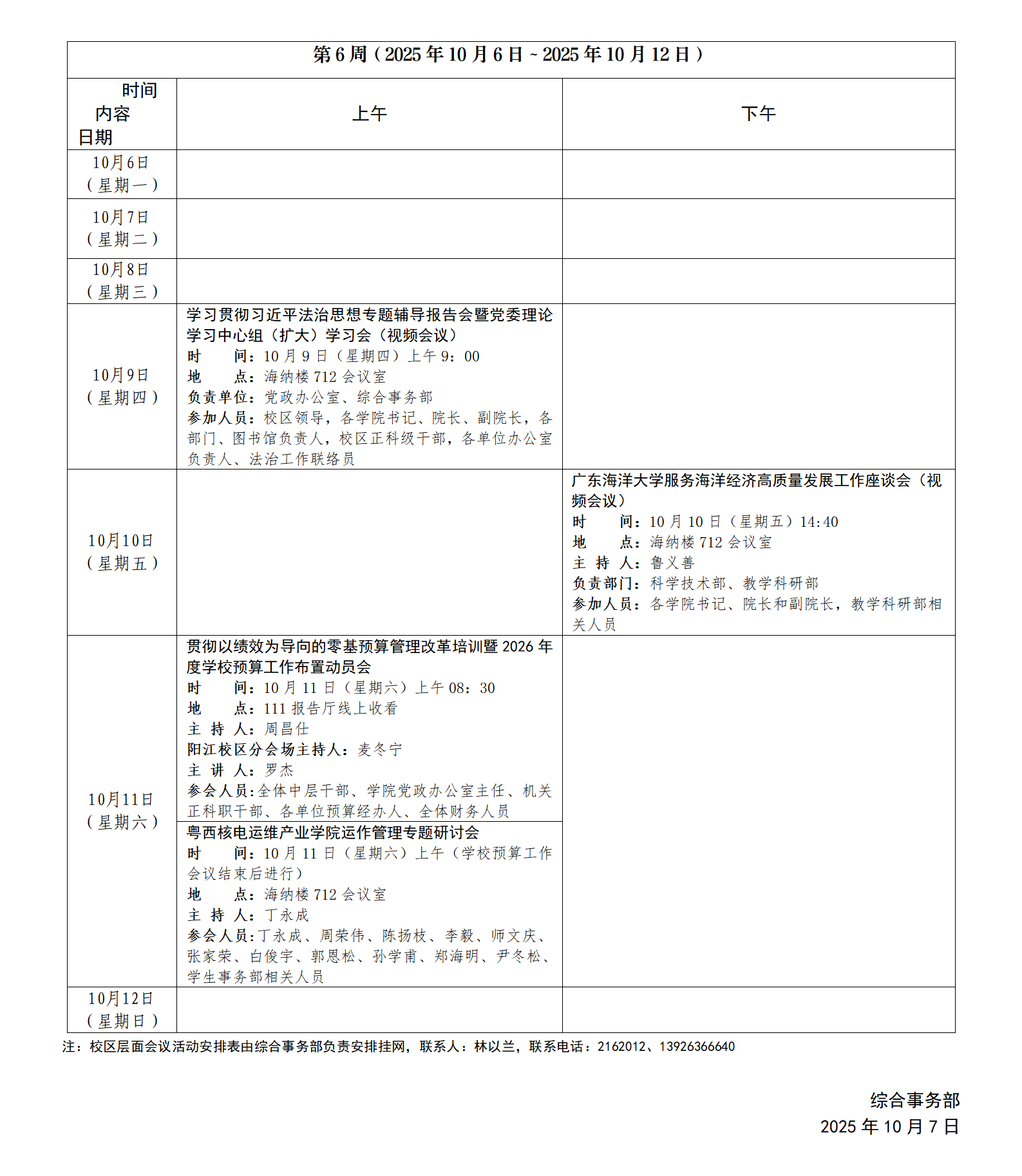 2025~2026学年第一学期第6周会议活动安排表